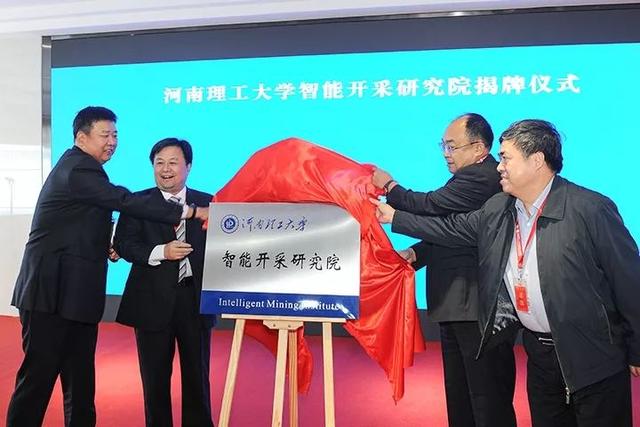 (付祖冈、韩晓东、李炜、赵善扬,共同为河南理工大学智能开采研究院揭牌)