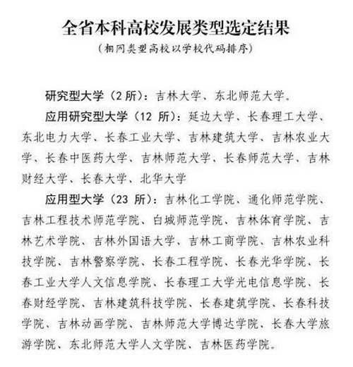 同时,吉林省教育厅还公布了全省普通本科高等学校发展类型选定结果,其中研究型大学2所,应用研究型大学12所,应用型大学23所。