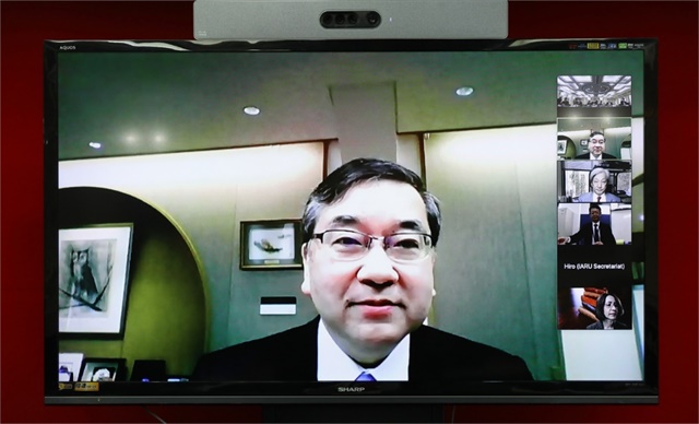 郝平指出,新冠肺炎疫情爆发后,北京大学与东京大学互致信函,表达关切,相互鼓励,寻求合作,体现了两校深厚的友谊。一直以来,双方在多个领域合作卓有成效,特别是同为国际研究型大学联盟的成员学校,在高等教育多边合作中成果突出。作为与国家和民族命运紧密相连的大学,北大在危机面前主动承担使命与责任,组织医疗团队驰援武汉,承担危重症病人救治工作;在流行病研究、疫苗研发方面加大投入,为国家疫情防控作出了贡献;同时克服困难,确保线上教学正常、平稳、有序开展。郝平强调,在这场人类社会共同面临的危机中,人类是休戚与共的命运共同体。国际高校之间在应对人类共同挑战方面应发挥重要作用,承担重要使命,进行更广泛深入的交流。他希望以此次交流为契机,进一步深化两校在在线教学、医学等方面的合作,共克时艰,共同续写合作新篇章。