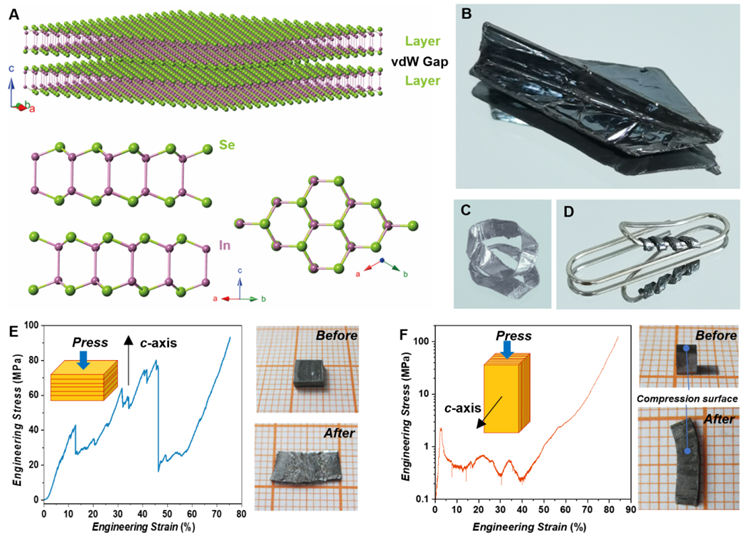 图1. InSe单晶块体的超常塑性。(A)晶体结构;(B-D)样品可折叠或弯曲成“纸飞机”、莫比乌斯环、螺旋圈等各种形状而不破裂;(E)沿c轴与(F)垂直c轴方向压缩的应力-应变曲线及压缩前后样品照片。