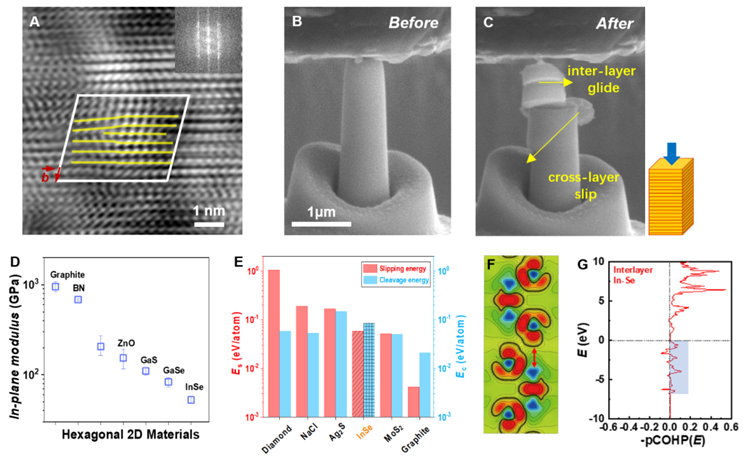 图2 InSe塑性变形机制与机理。(A)刃位错的反傅里叶变换扫描透射暗场像(IFT-DF-STEM);(B-C)扫描电镜(SEM)下原位压缩实验,揭示了层间滑动与跨层滑移;(D)常见六方结构二维材料的面内杨氏模量;(E)滑移能与解理能;(F)差分电荷密度与(G)晶体轨道哈密顿分布密度(COHP),间接佐证了层间长程作用力的存在。