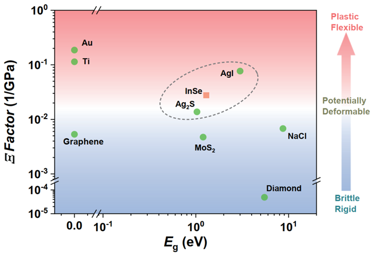 基于InSe单晶特殊的力学性质和化学键特性,该工作提出了一个评价和预测(准)二维材料变形能力的X 因子:X = Ec/Es (1/Ein),其中Ec是解理能,Es是滑移能,Ein是沿着滑移方向的杨氏模量。具有高解理能、低滑移能、低杨氏模量的材料有望具有良好的塑性变形能力。该判据很好地解释了目前已发现的两种无机塑性半导体Ag2S和InSe,也为其他新型塑性和可变形半导体的预测和筛选提供了理论依据(图3)。