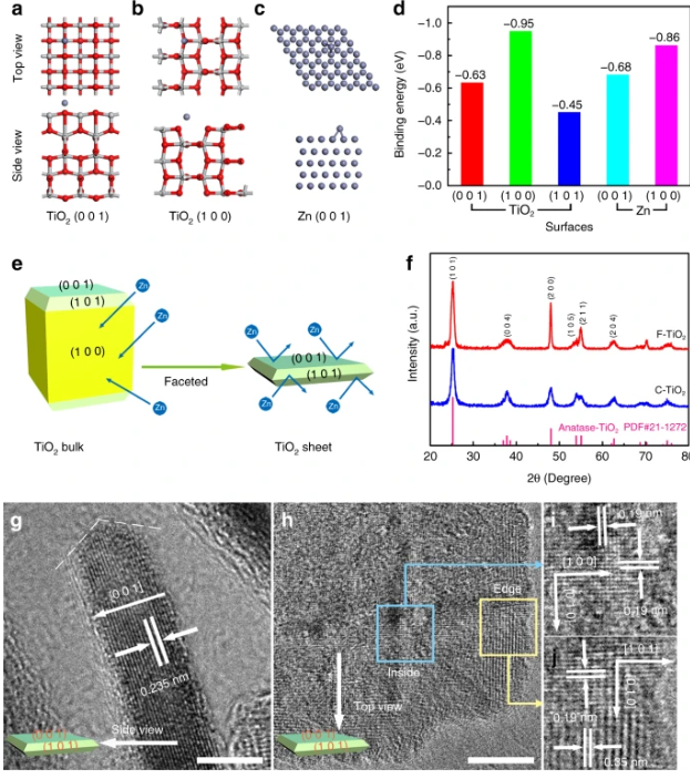 鉴于此,该团队通过在商业化锌箔上涂覆高度暴露(0 0 1)面的TiO2保护层,可以制备出没有外部枝晶生长的高性能锌负极。受益于TiO2的特定晶体取向以及对锌吸附的排斥作用,在电场作用下的锌离子在负极表面富集。因此,增加的界面锌离子浓度可以诱导均匀的形核,并进一步引导锌的横向生长。所制备的锌负极具有出色的剥离和沉积性能,且具有很长的工作寿命(在1 mA cm-2下,1 mAh cm-2时为460 h)。更重要的是,通过调整晶面的暴露来改变亲锌性的策略可以深入了解亲金属性的内部机制,并且可以扩展到其他金属负极的界面改性。