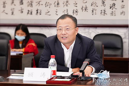 顾涛在座谈会发表致辞。他表示,2018年12月,中国人民大学与内蒙古自治区人民政府签署了战略合作框架协议。此后,双方积极落实协议相关规定,加强合作交流,在教育科研、干部培训、人才交流等方面探索建立了多层次的交流机制,取得了丰硕的成果,也为呼和浩特市与人民大学深入开展合作奠定了坚实的基础。人民大学与呼和浩特市签署市校合作协议,就是要在前期区校合作的良好基础之上,进一步深化双方合作,将中国人民大学强大的智力、学科、人才优势与呼和浩特市丰富的自然资源、区位优势结合好,在新的起点上深入推进市校、区校合作。