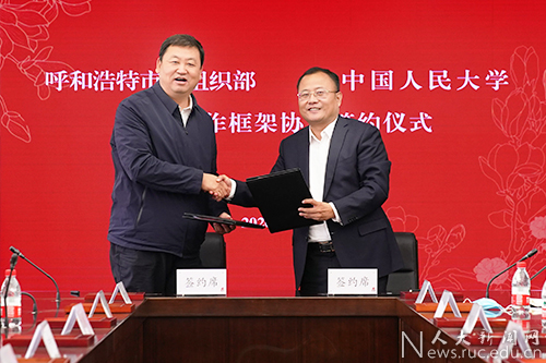 座谈会上,常培忠与顾涛代表合作双方签署《呼和浩特市与中国人民大学战略合作框架协议书》。