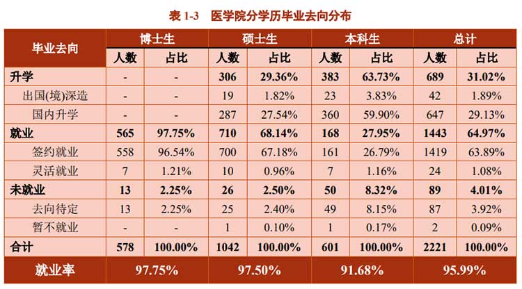 分学历层次来看,医学院本科、硕士和博士毕业生的就业率分别为91.68%、97.50%和97.75%。从毕业去向分析来看,本科生以国内升学(59.90%)为主,签约就业(26.79%)次之;硕士生以签约就业(67.18%)为主,国内升学(27.54%)次之;博士生去向较为集中,超九成均为签约就业。