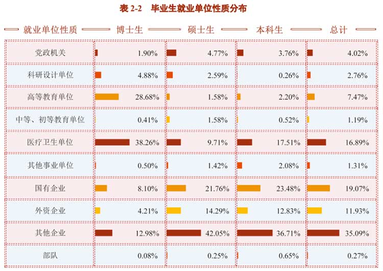 从就业单位性质来看, 2020年毕业生中,企业单位为吸纳毕业生就业的主渠道,占比达66.09%,其中国有企业占比19.07%,医疗卫生单位占比16.89%。分学历层次来看,毕业生具体流向单位类型存在差异,其中博士生单位流向以医疗卫生单位(38.26%)和高等教育单位(28.68%)为主,硕士生和本科生单位流向以其他企业和国有企业为主。