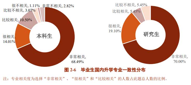 从毕业生国内升学专业一致性分布来看,毕业生国内升学专业延续性较高,升学专业与原专业的相关度分别为本科生93.00%、研究生94.55%。