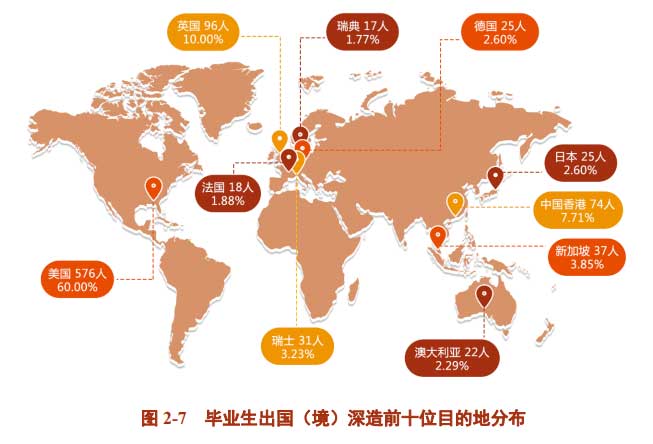 出国(境)深造方面,有960名毕业生选择出国(境)深造,其中硕士生160人,本科生800人。2020年毕业生选择出国(境)深造的国家(地区)主要分布在美国(576人)、英国(96人)、中国香港(74人)、新加坡(37人)、瑞士(31人)等国家(地区)。