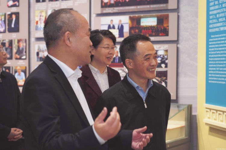 郑富芝一行参观了古朴典雅的校史馆。在“百年沧桑”展厅,窦贤康介绍了武汉大学的校史溯源。从自强学堂的创办、老校长王世杰的治学名言“武大不办则已,要办就当办一所有崇高理想、一流水准的大学”,到武大西迁乐山办学、査全性院士首倡恢复高考、在全国率先实行学分制……郑富芝对武汉大学深厚的文化底蕴和办学历程颇感兴趣,与肖菊华、窦贤康交流讨论,言谈融洽。