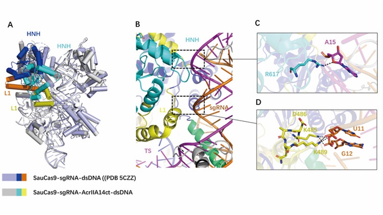 CRISPR-Cas系统因其便捷的操作性以及非常高的体内编辑效率,成为目前应用最为广泛的基因编辑工具。但在实际应用中还面临很多亟需解决的问题,其中一个重要的问题就是由于其不可控的剪切活性带来基因编辑的脱靶效应。如何给基因编辑系统装上刹车,控制其编辑活性一直是领域内尝试解决的问题。CRISPR-Cas系统作为细菌的适应性免疫系统用于噬菌体入侵,面对细菌的CRISPR-Cas的选择压力,噬菌体进化出了相对应的拮抗机制,即噬菌体进化出Anti-CRISPR蛋白抑制细菌CRISPR-Cas系统的活性。在之前的研究中,发现Anti-CRISPR蛋白AcrIIA14能够抑制SauCas9的活性,但具体的分子机制并不清楚。