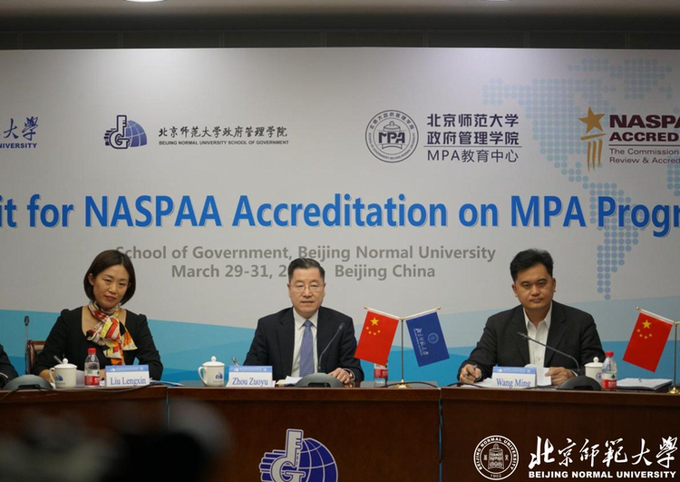 北师大政府管理学院自2017年正式启动申请NASPAA国际认证工作,成立了以MPA教育中心为基础的认证工作小组。学校领导和教务部等职能部门为MPA教育项目运行提供了重要的资源和政策支持;教师、学生、校友、用人单位代表、咨询委员会专家等先后参与到该项工作中。围绕北京师范大学“学为人师、行为世范”的校训、“一体两翼”的发展战略以及政府管理学院“政管经世、致知明德”的院训,MPA教育项目全方位建立了符合国际一流、中国特色与北师大风格的公共管理人才培养标准体系与评估体系,并秉持“以评促建”的宗旨不断优化人才培养模式、加强教师团队建设、改善管理服务工作。2018年12月,政府管理学院正式成为NASPAA会员单位;2019年6月-2020年12月,政府管理学院MPA教育项目通过了资格审查与自评阶段;2021年3月,NASPAA 前任主席Jack Meek教授带领考察小组进行为期三天的线上实地考察。考察小组查阅了公共管理学科发展与MPA教育项目的相关资料,分别与校领导、院领导、MPA项目负责人、教师代表、学生代表、校友代表、用人单位代表、咨询委员会专家等进行了多轮座谈,形成反馈意见报告交NASPAA认证评审委员会审议;2021年7月,认证评审委员会根据政府管理学院提交的MPA教育项目认证材料以及实地考察小组专家反馈意见报告,做出政府管理学院MPA教育项目通过NASPAA认证的决定,并给与七年(2021-2028年)的免认证期限。