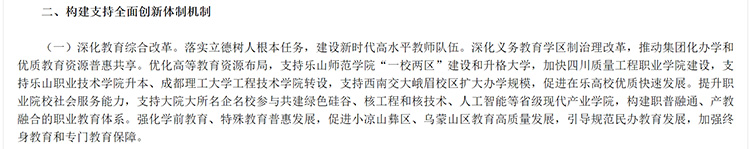 优化高等教育资源布局,支持乐山师范学院“一校两区”建设和升格大学,加快四川质量工程职业学院建设,支持乐山职业技术学院升本、成都理工大学工程技术学院转设,支持西南交大峨眉校区扩大办学规模,促进在乐高校优质快速发展。