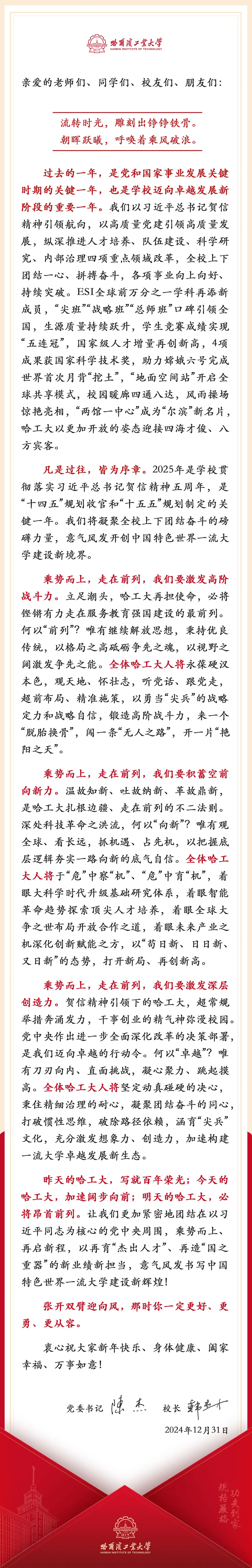 哈尔滨工业大学2025年新年献词:乘势而上 走在前列