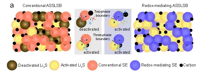 随着对高能量密度、长寿命电池的需求不断增加,全固态电池由于具有较高的安全性和比能量,在电动交通等应用中具有很强的竞争力。基于硫正极和锂负极的全固态锂硫电池具有高比能量,且其适中的电位不会导致固态电解质过度副反应,充电时不会释氧,因此具有更高的本征安全性。然而,全固态锂硫电池中的固固硫转换反应,只能在固态电解质、活性材料和碳之间的三相边界发生,因此反应动力学缓慢,导致电池的速率性能和循环寿命较差(图1)。