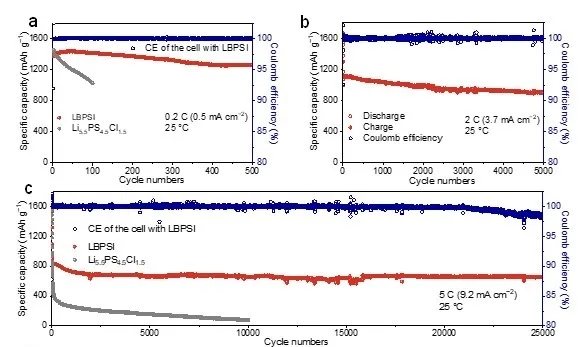 图2. 基于LBPSI电解质的全固态锂硫电池的常温循环性能。