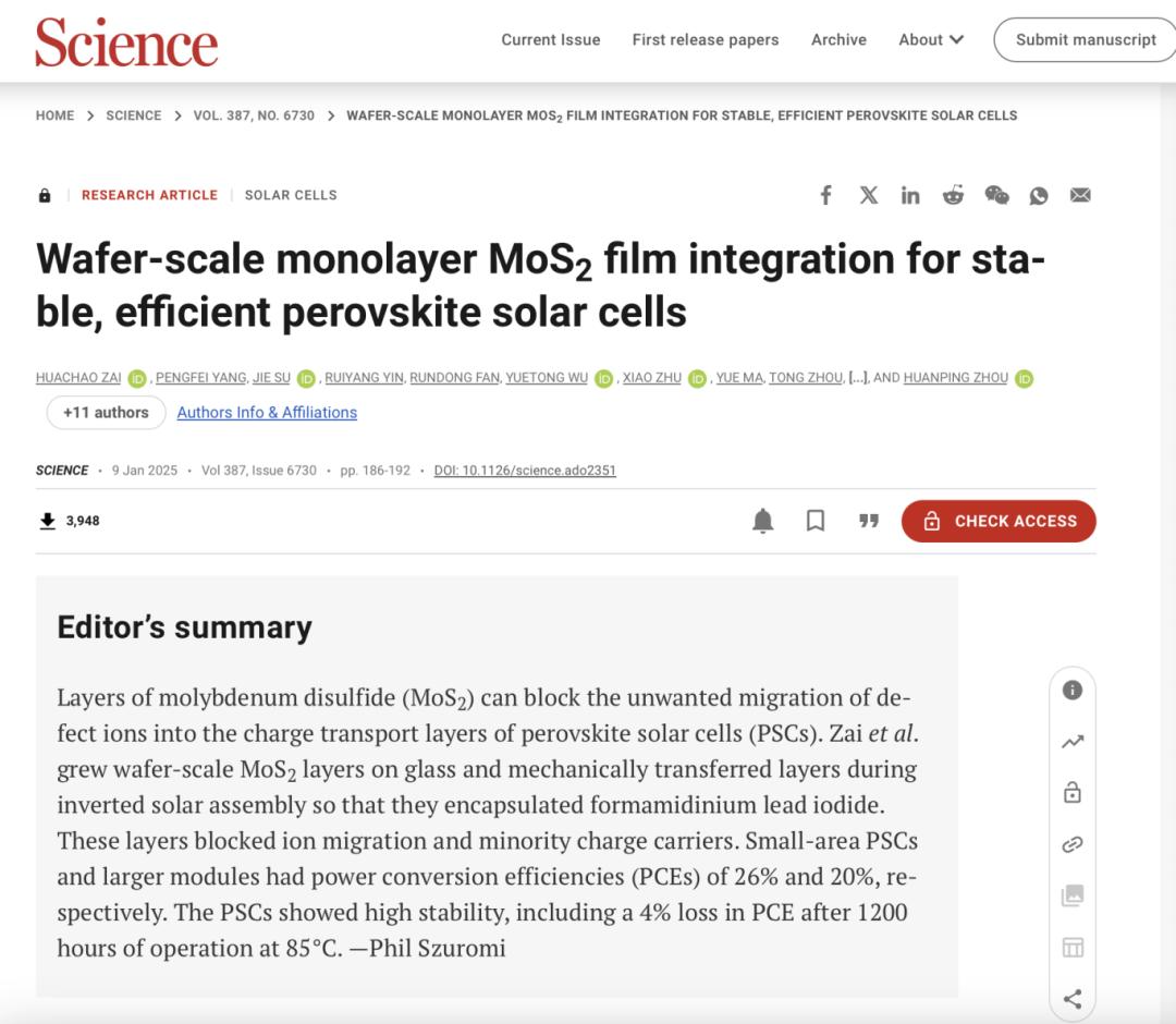 1月9日,北京大学周欢萍教授、张艳锋教授(共同通讯作者)在Science上发表了题为“Wafer-scale monolayer MoS2 film integration for stable, efficient perovskite solar cells”(晶圆级单层MoS2薄膜集成实现稳定、高效的钙钛矿太阳能电池)的研究论文。