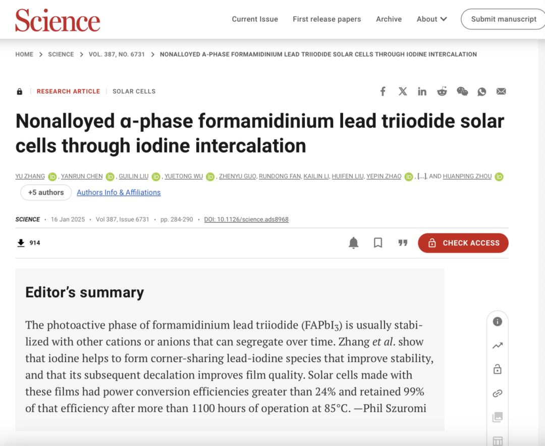1月16日,周欢萍教授为独立通讯作者,再度在Science发表了题为“Nonalloyed α-phase formamidinium lead triiodide solar cells through iodine intercalation”(通过碘嵌入制备非合金α-FAPbI3太阳能电池)的研究论文。这是Science期刊在一周之内连续两次刊发周欢萍团队在钙钛矿太阳能电池领域的研究进展。