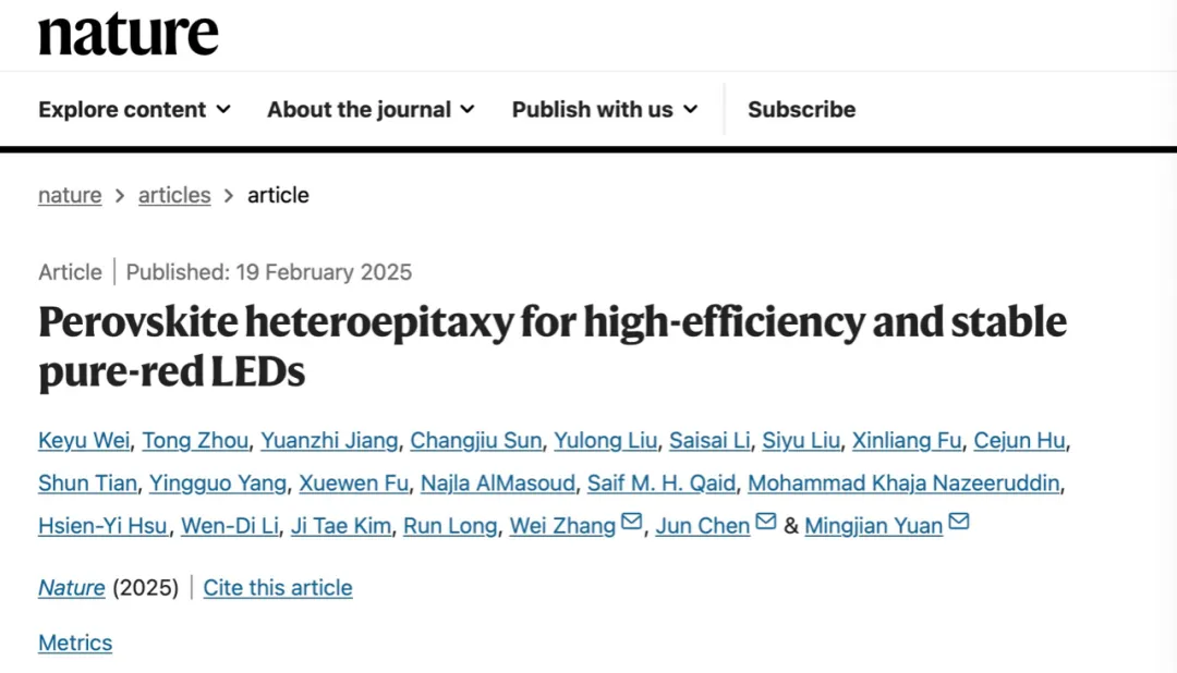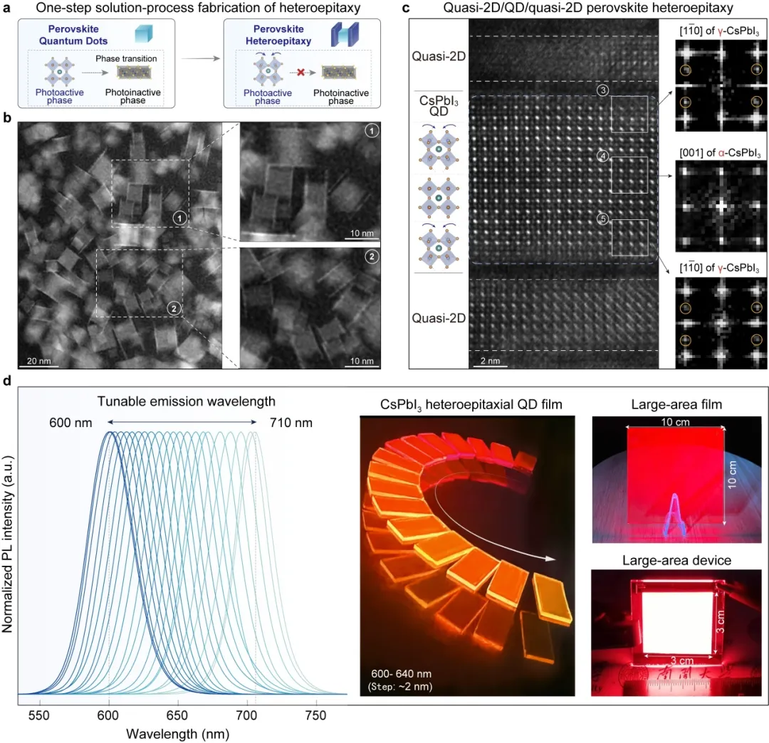 该研究题为“Perovskite heteroepitaxy for high-efficiency and stable pure-red LEDs”。团队针对新型钙钛矿超高清显示技术中纯红光CsPbI3钙钛矿量子点材料相稳定性差这一世界难题,率先提出“外延异质结界面应力操控”策略,首次利用全溶液法实现钙钛矿范德华外延异质结的大面积原位可控制备,成功突破材料稳定性与器件性能双重瓶颈,研发出高效率与高稳定性兼备的纯红光钙钛矿电致发光器件 (LED),为下一代超高清显示技术发展提供了关键技术支撑,标志着在该领域的重大技术突破。