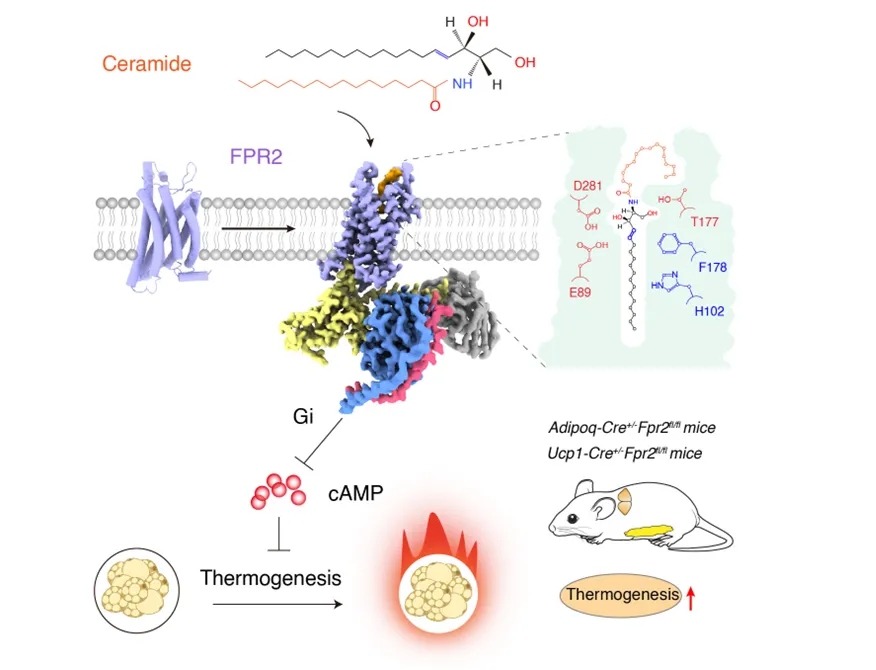 该研究首次发现了脂肪细胞中的神经酰胺膜受体FPR2,系统阐明了神经酰胺-FPR2信号轴调控脂肪产热的作用机制,揭示了FPR2特异性识别神经酰胺的分子机制。这项突破性工作不仅为深入理解神经酰胺的生物学功能提供了全新视角,更为代谢性疾病的靶向治疗开辟了新的研究方向。