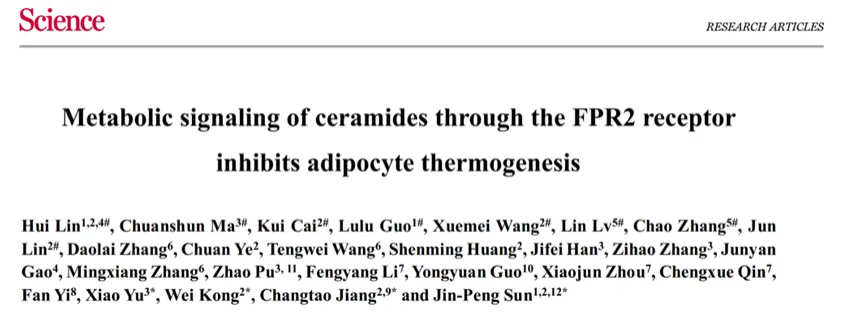 3月14日,山东大学基础医学院孙金鹏教授团队,联合北京大学医学部基础医学院姜长涛教授和孔炜教授团队、山东大学于晓教授团队,在《科学》(Science)在线发表研究论文“Metabolic signaling of ceramides through the FPR2 receptor inhibits adipocyte thermogenesis”。