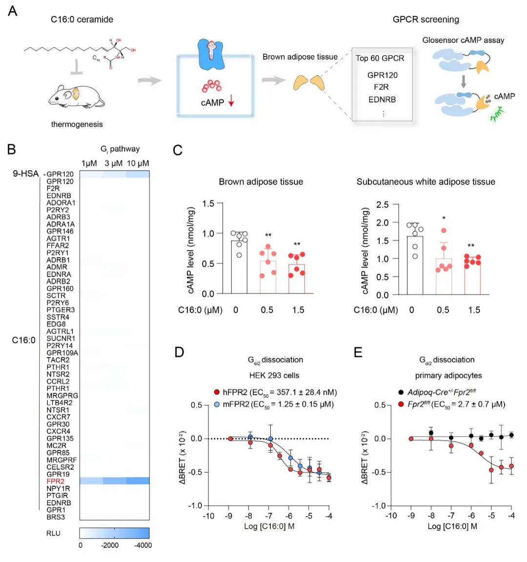 神经酰胺作为鞘磷脂代谢核心分子,其异常累积与糖尿病、肥胖及动脉粥样硬化等代谢疾病密切相关。研究团队发现神经酰胺可能通过一种Gi偶联的GPCR调控脂肪产热,利用GPCR高灵敏多通路信号检测系统,鉴定出FPR2是脂肪细胞中Gi偶联的神经酰胺受体。通过基因敲除和拮抗剂实验证实C16:0神经酰胺通过激活FPR2受体抑制脂肪产热。