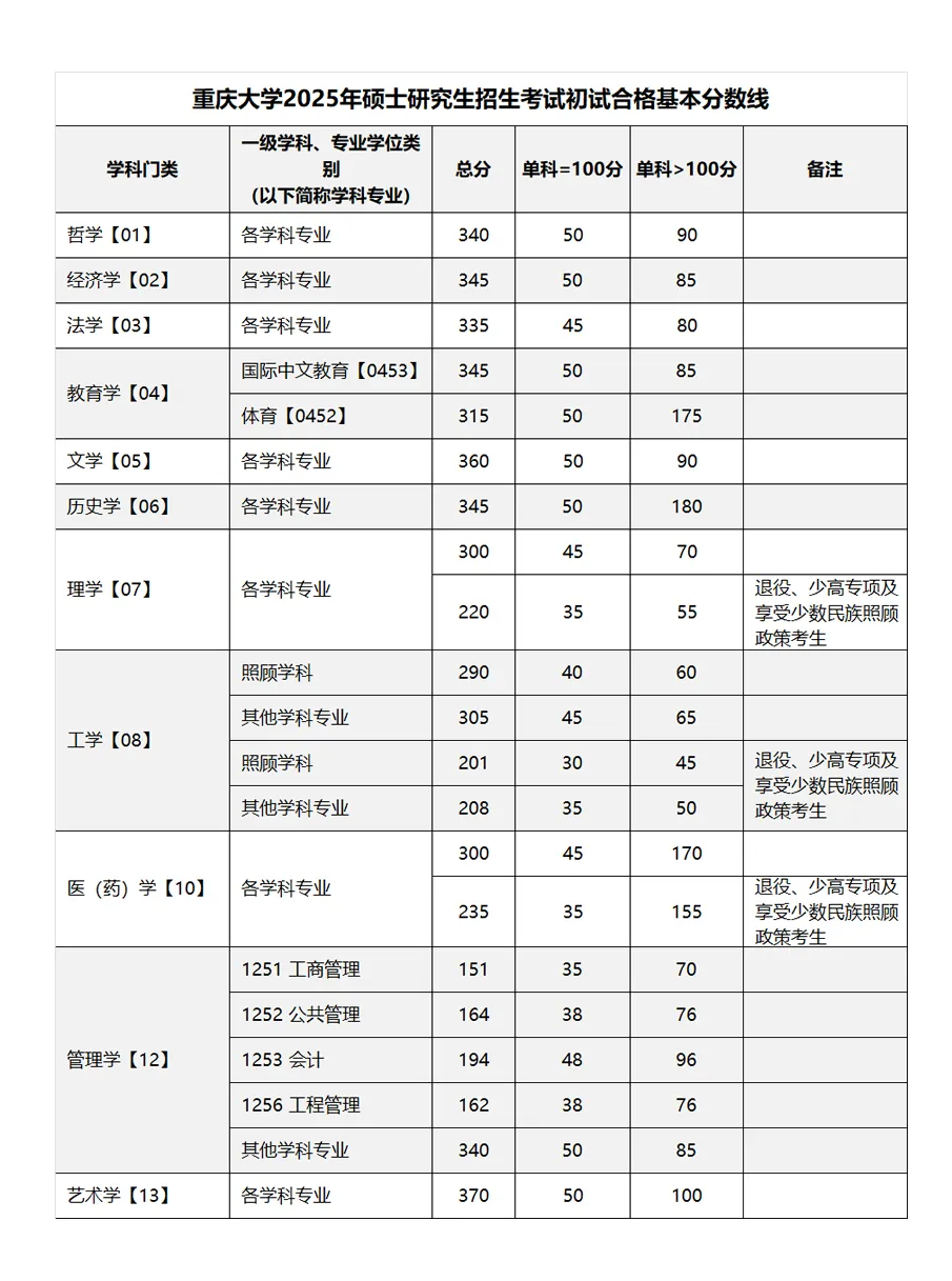 2.学校分数线是考生初试合格的最低成绩要求。学院可根据本单位学科(方向)特点、生源情况和招生计划数确定不低于学校线的成绩要求(二次划线)。二次划线将于2025年3月17日左右公布,请考生密切关注重庆大学研究生招生信息网。