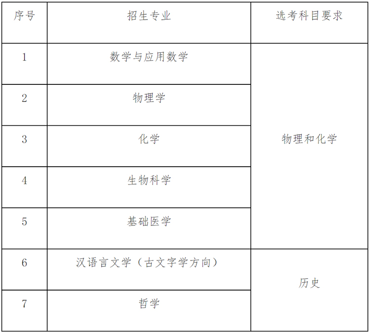 为突出基础学科在国家关键领域的支撑引领作用,同时聚焦国家人才紧缺的人文社会科学领域,我校强基计划招生专业设置如下:数学与应用数学、物理学、化学、生物科学、基础医学、汉语言文学(古文字学方向)﹑哲学,具体分省分专业招生计划以报名系统内公布为准。