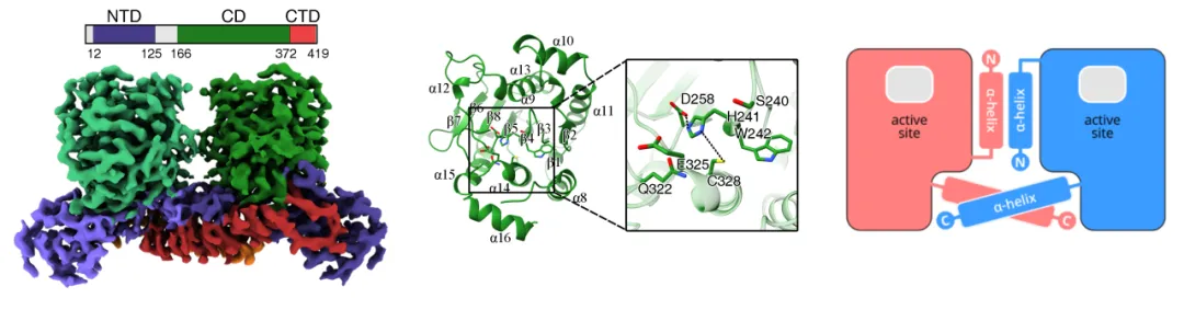 研究团队成功表达并纯化了具有活性的猴痘病毒核心蛋白酶,结合单颗粒冷冻电镜和X射线晶体衍射技术,解析了其高分辨率的三维结构(图1)。核心蛋白酶呈现出二体的组装模式,每个单体包括N端结构域(N-terminal domain, NTD),催化结构域(catalytic domain, CD)和C端结构域(C-terminal domain, CTD)。活性中心位于催化结构域,包含一个催化三联体Cys328-His241-Asp258。猴痘病毒核心蛋白酶的二体相互作用模式与其他重要人类病毒的蛋白酶不同,是核心蛋白酶结构稳定和发挥催化功能的关键。