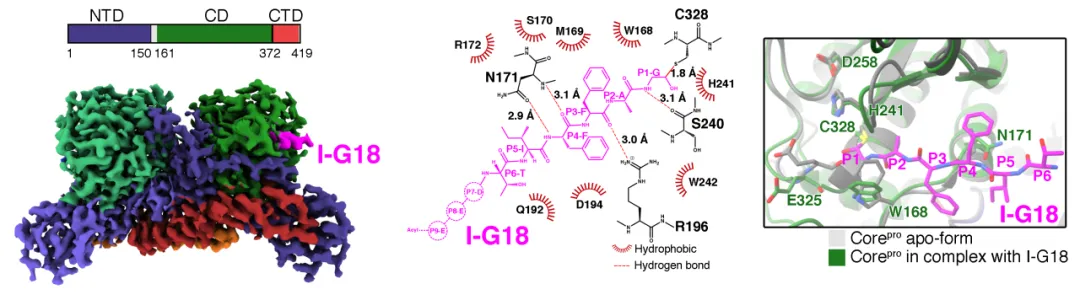 因此,为了开发更强效的新型靶向抑制剂,研究团队开展了病毒核心蛋白酶底物识别和催化机制的研究。研究人员以核心蛋白酶一种天然底物P25K的序列为基础,设计了一段C末端醛基取代的底物类似物I-G18。I-G18能够与核心蛋白酶的催化中心的Cys328共价结合,模拟催化中间态的结构特征。研究团队通过冷冻电镜技术,解析了这一复合物的三维结构(图2)。发现在底物的诱导下,核心蛋白酶活性中心发生一系列构象变化,在S1和S2位形成特征的狭长口袋,仅可容纳P1位Gly和P2位Ala这两个侧链极短的氨基酸,解释了核心蛋白酶对底物中这两个位置氨基酸的高度选择性。