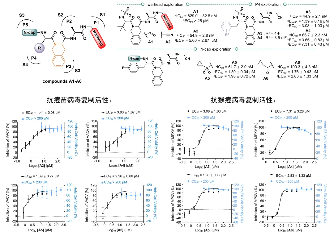 以核心蛋白酶的底物识别机制为基础,研究团队设计合成了一系列拟肽类抑制剂,其中A3-A6具有高效的病毒核心蛋白酶抑制活性(IC50范围:44.9 nM~100.3 nM),且表现出较强的抗猴痘病毒活性(EC50范围:1.98 μM~7.31 μM)和抗痘苗病毒活性(EC50范围:1.39 μM~3.66 μM),同时具有良好的安全性(CC50大于200 μM)。研究人员解析了抑制剂A3与核心蛋白酶的复合物结构,他们发现A3不仅可以与蛋白酶的催化中心的Cys328形成共价键,还可以利用其化学修饰基团同底物结合口袋的氨基酸残基形成额外的氢键相互作用,以增强其结合能力。这些研究结果表明了化合物A3-A6在后续开发广谱抗痘病毒抑制剂上的具有巨大潜力,是良好的先导化合物。