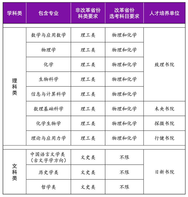 基础文科类专业包括:中国语言文学类(古文字学方向)、历史学类、哲学类专业,旨在选拔并培养在基础文科领域有特长且有志于从事相关研究的学生。