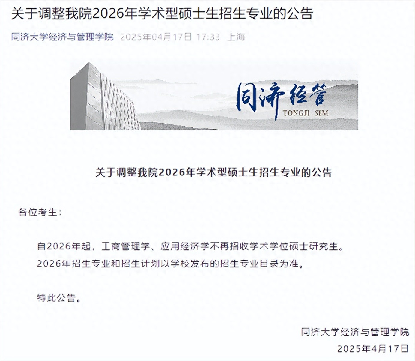 日前,同济大学经济与管理学院发布《关于调整我院2026年学术型硕士生招生专业的公告》,自2026年起,工商管理学、应用经济学不再招收学术学位硕士研究生。