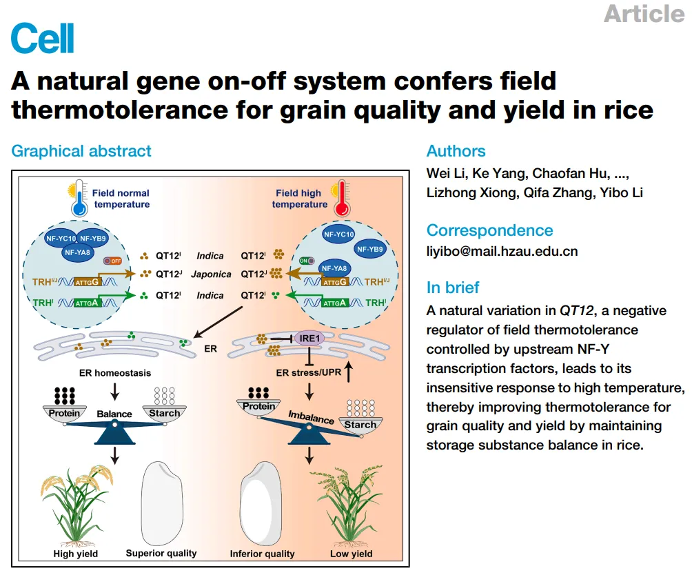 北京时间4月30日,国际期刊《细胞》(Cell)发表了华中农业大学作物遗传改良全国重点实验室、生命科学技术学院、湖北洪山实验室水稻团队李一博教授课题组题为“一个天然的基因开关系统协同赋予水稻品质和产量田间耐热性”(A natural gene on-off system confers field thermotolerance for grain quality and yield in rice)的研究论文。