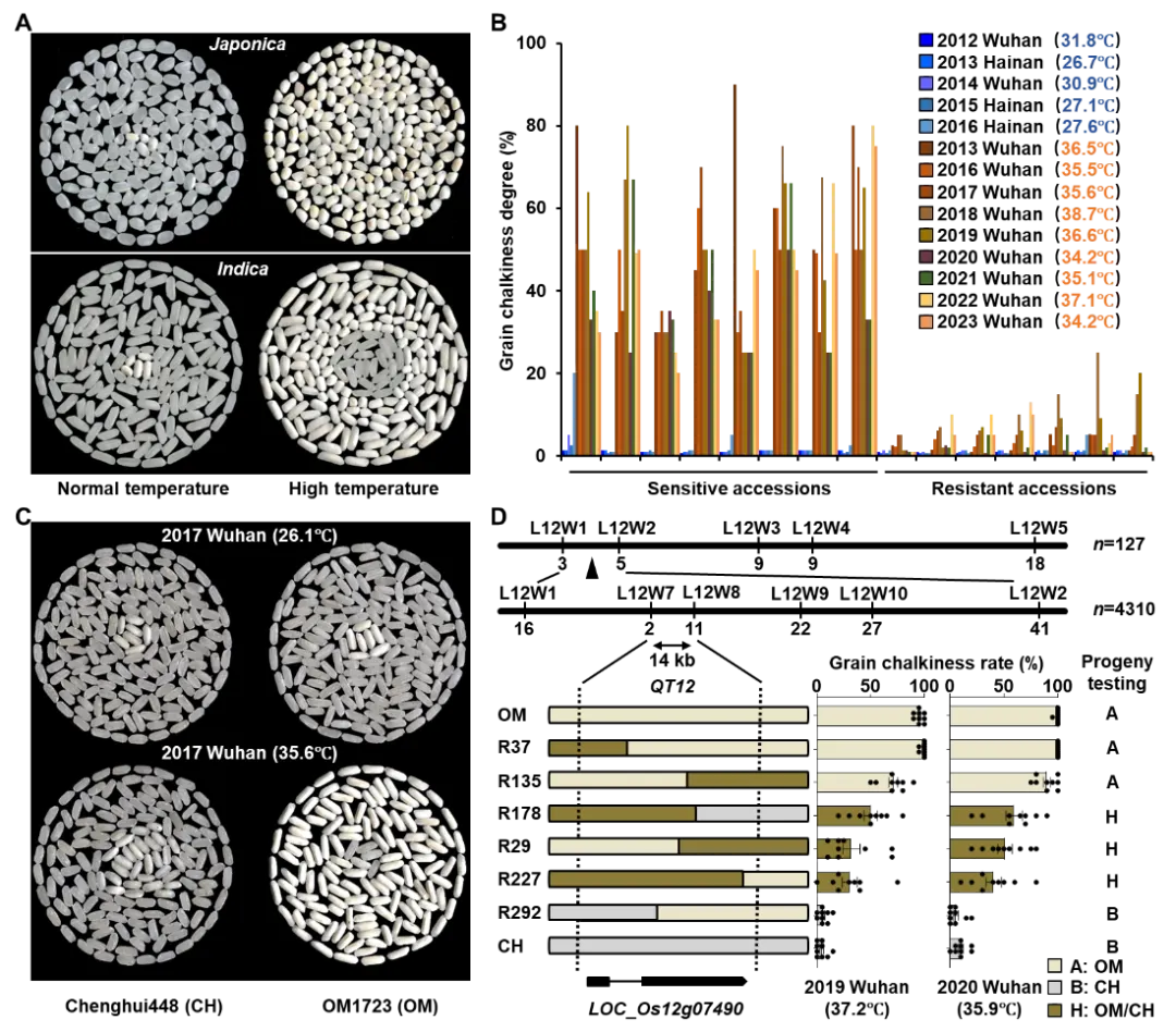 在这项研究中,经过长达10余年的灌浆期田间自然高温抗性种质的大量筛选和鉴定,研究团队利用自主研发的快速、高通量克隆作物重要农艺性状功能基因的RapMap方法(Zhang et al. NC, 2021),从大田耐热水稻种质中克隆到首个调控品质耐高温的主效QTL基因QT12,该基因同时表现出优异的产量耐热性。这一发现突破了传统温室筛选、苗期鉴定方法不能反映真实环境的局限,解决了长期困扰科学界的“耐高温表型难鉴定、耐高温基因难应用”的瓶颈问题。