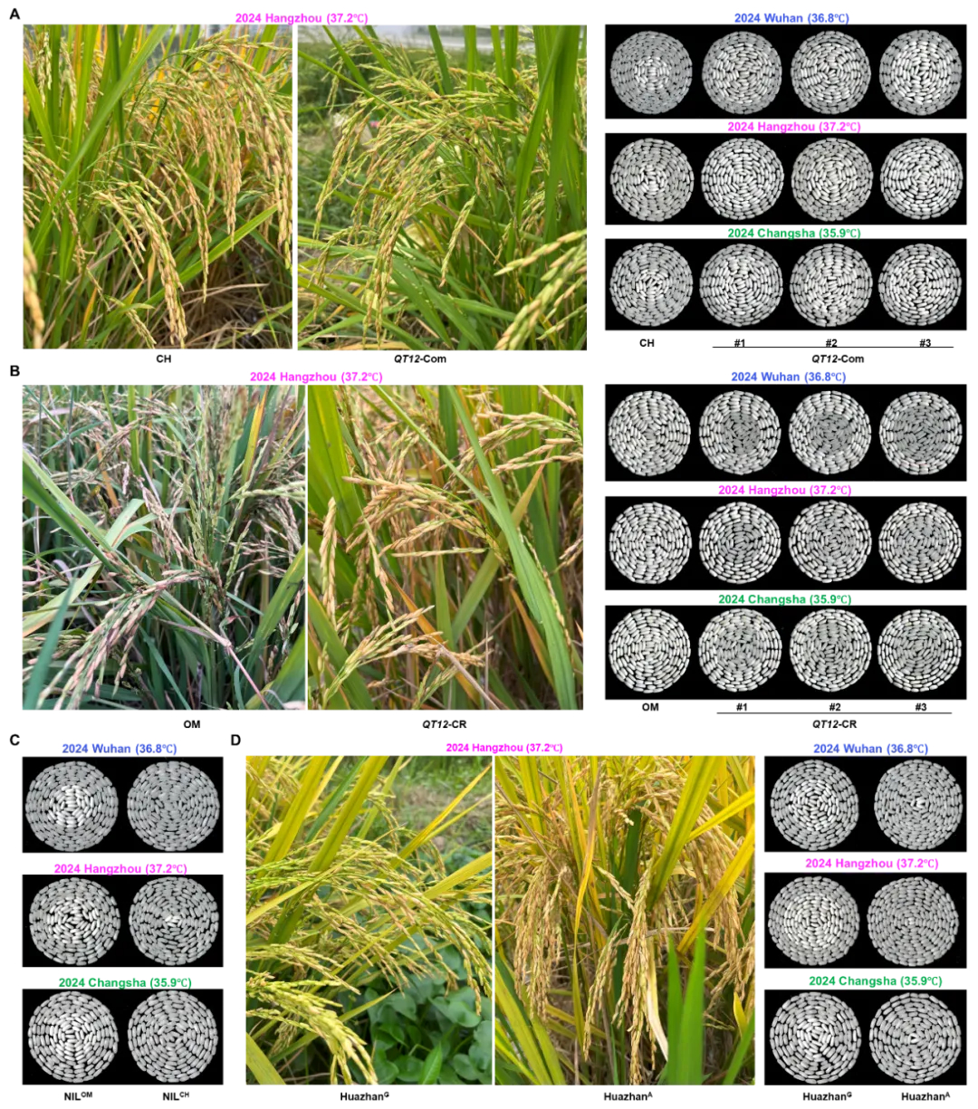 长江流域是我国第一大水稻主产区,种植面积和年产量均约占全国总量的三分之二,然而近10年来该稻区极端高温天气频发,给水稻稳产与优质带来了严峻挑战。然而,QT12基因的研究为这一难题带来了突破性解决方案。通过2023和2024年武汉、杭州和长沙等长江流域极端高温下的大规模田间试验,低表达QT12基因在高温环境下表现出很强的耐热性:与野生型相比,CRISPR编辑的QT12基因突变株系在武汉、杭州和长沙的小区产量分别提升了92.5%、64.1%和54.7%,同时显著降低了稻米垩白率和垩白度,提升了稻米外观品质和食味品质。