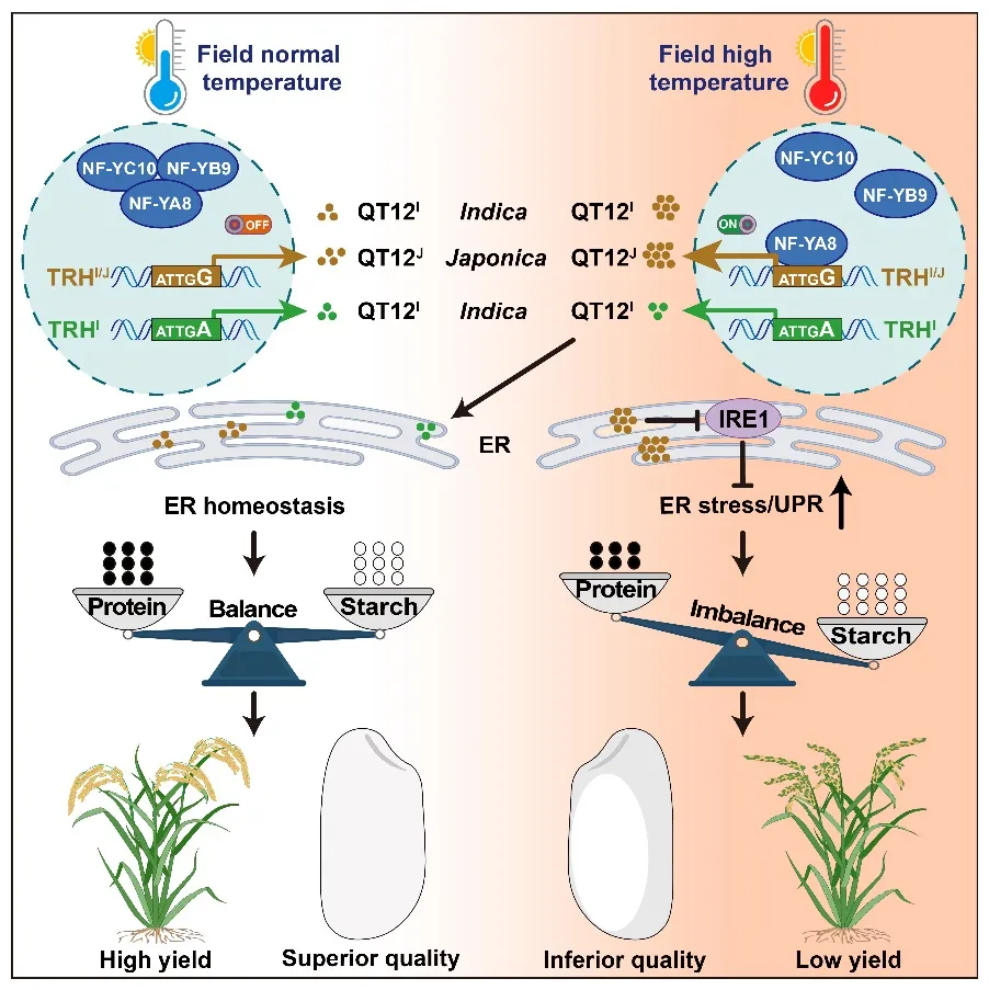 研究团队进一步发现,胚乳特异表达的核因子NF-YA8、NF-YB9与NF-YC10形成一个复合体差异结合到QT12启动子CCAAT-box元件的G/A变异上,对QT12表达和耐热性进行差异调控。该自然变异(初级开关)与NF-Y亚基间独特的抑制性调控机制(次级开关)形成了一个天然的基因开关系统:QT12启动子区域关键的G/A功能性变异,作为“初级开关”直接决定NF-YA8对QT12激活的开/关(第一层锁);而高温则作为“次级开关”的推动器,释放了NF-YB9和NF-YC10对NF-YA8激活QT12的抑制,从而打开了次级开关(第二层锁)。当二级开关同时打开(“双生锁”同时打开),高温信号就能顺利传递并激活QT12的表达,通过抑制UPR感受器IRE1而过度激活UPR及UPR激活的bZIP60、bZIP50等转录因子,进而抑制储藏蛋白合成基因的表达和激活淀粉合成基因的表达,从而打破储藏蛋白与淀粉的稳态,最终实现高温敏感性。