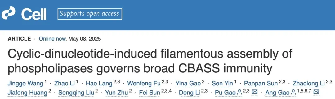 文章题为Cyclic dinucleotide-induced filamentous assembly of phospholipases governs broad CBASS immunity,揭示了CBASS系统磷脂酶类效应蛋白在响应环状寡核苷酸分子后,自组装形成超分子纤维结构,进而降解细菌内膜完成细胞杀伤的分子机制。这一发现不仅拓展了细菌免疫应答的多样性,也为开发新型抗病毒策略和可控细胞裂解工具提供了理论依据。