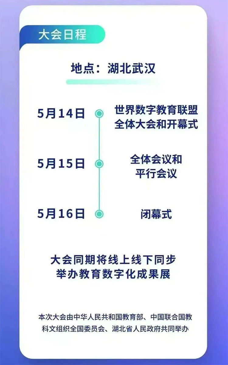 2025世界数字教育大会由教育部、中国联合国教科文组织全国委员会、湖北省人民政府共同举办,主题为教育发展与变革:智能时代Education Development and Transformation:The Era of Intelligence ,旨在回应联合国关于全球教育变革有关倡议呼吁共同推进智能时代的教育发展与变革。