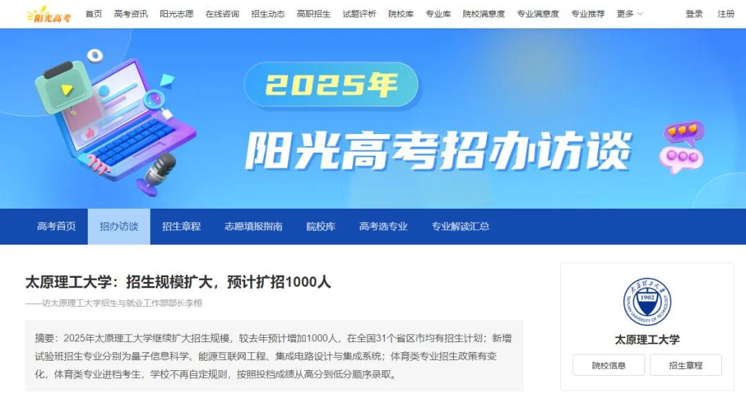 据阳光高考官网消息,近日,太原理工大学招生与就业工作部部长李栩在接受访谈时提到,2025年太原理工大学继续扩大招生规模,较去年预计增加1000人,在全国31个省区市均有招生计划,分省招生计划预计会在往年的基础上略微上调。