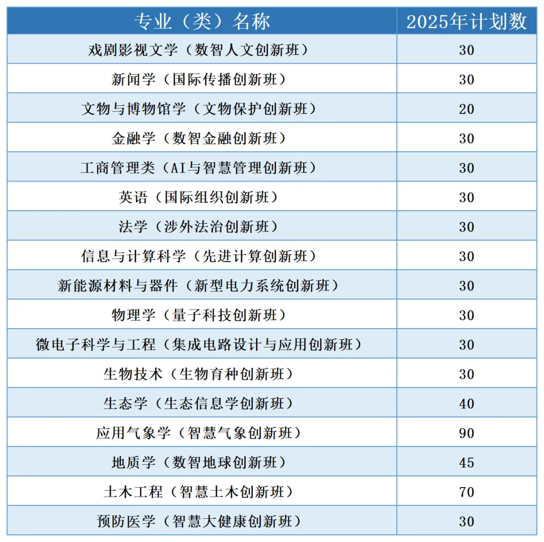 打破学科壁垒,聚焦关键领域,抢占人工智能、量子科技等新兴领域,联动25个学院,全新开设17个交叉班型,培养信息化、国际化、应用型的高端复合型人才,2025年通过高考直接招生625人,所有省份均有覆盖。