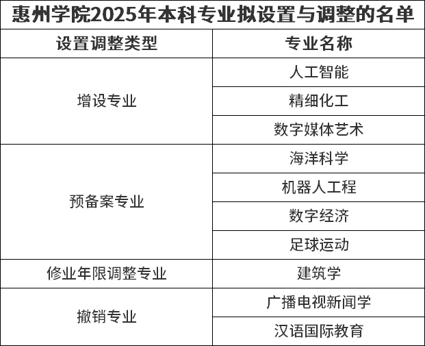 近日,惠州学院发布《惠州学院2025年本科专业设置调整情况的公示》。根据《广东省教育厅转发教育部高等教育司关于开展2025年度普通高等学校本科专业设置工作的通知》,教务部启动了2025年专业设置调整优化工作。经二级学院申报、教务部审核、教学指导委员会审议和投票表决、第611次校长办公会审议通过,学校拟向教育部申请新增人工智能、精细化工、数字媒体艺术3个本科专业,预备案海洋科学、机器人工程、数字经济、足球运动4个本科专业,调整建筑学专业的修业年限(由5年调整为4年),撤销广播电视新闻学、汉语国际教育2个本科专业,并将2025年本科专业拟设置与调整名单予以公示。