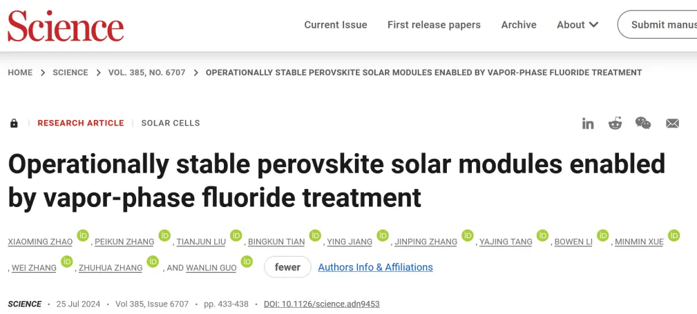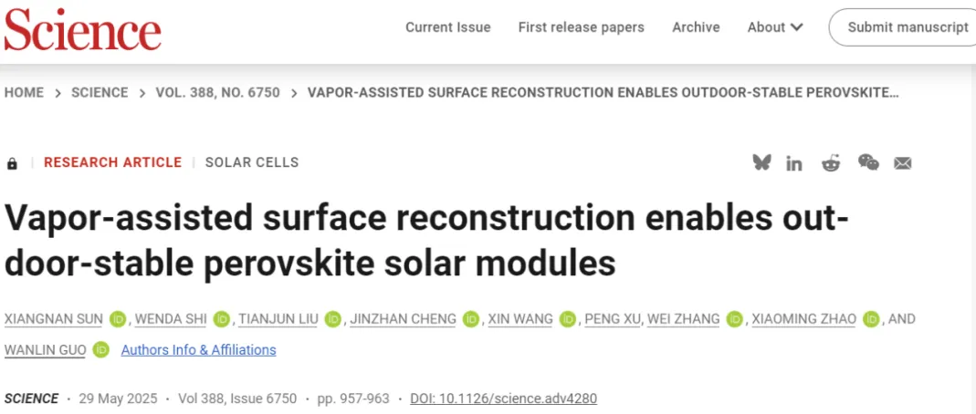南京航空航天大学国际前沿科学研究院郭万林教授和赵晓明教授团队继2024年7月开发气相氟化技术实现大面积钙钛矿太阳能电池的均匀稳定化后,于2025年5月30日再次在《Science》发表最新成果“Vapor-assisted surface reconstruction enables outdoor-stable perovskite solar modules”,开发了更绿色、更具经济性的气相辅助表面重构技术,抑制了产业级钙钛矿模组在户外环境下的不可逆退化,在30 cm × 30 cm钙钛矿模组中首次实现与商用晶硅太阳能电池相当的户外运行稳定性。