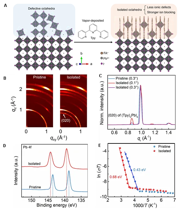 针对上述问题,团队开发出更绿色、更具经济性的“气相辅助表面重构”技术,相较于前代气相氟化技术,新方法无需专用设备,仅通过气相沉积多齿配体即可实现钙钛矿表面结构的原位重构,隔离缺陷富集的表面单元,实现离子不可逆迁移的抑制。这项创新技术不仅阐明了不可逆离子迁移是导致器件性能永久衰退的本质原因,更通过抑制该过程首次在钙钛矿电池上实现了与硅太阳能电池比肩的户外稳定性,同时工艺成本较前代技术大幅下降,且完全兼容现有光伏产线设备体系,为钙钛矿光伏技术的规模化应用扫清了关键障碍,标志着该领域从实验室创新向产业化落地迈出了里程碑式的一步。
