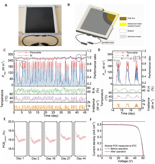 为了进一步考察钙钛矿模组的户外稳定性,在高温高湿的夏季将钙钛矿模组和商用晶硅太阳能电池一起对比,发现产业级钙钛矿模组展示出与商用晶硅太阳能电池相当的稳定性。并且由于钙钛矿电池较低的温度系数,其在高温条件下的功率保持率甚至优于晶硅太阳能电池,证明了钙钛矿太阳能电池实际应用的可能性。