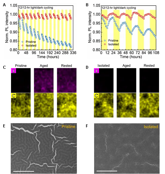 于是,带着进一步优化技术方案的目的,团队进行了深入的研究,并在户外实测中观察到了一个独特现象:钙钛矿模组在昼夜循环中呈现出有趣的“可逆衰减”行为,即模组在白天工作时会出现性能衰退,但经过夜晚的“休息”又能恢复部分性能。继续研究发现,这种特殊行为与钙钛矿薄膜中碘离子的可逆/不可逆迁移行为密切相关——可逆迁移发生在钙钛矿层内,所引起的性能衰减具有夜间自修复特性,而不可逆迁移涉及离子向电荷传输层或电极的逃逸,将导致器件性能的永久性衰退。
