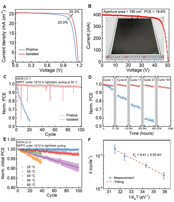 经过气相辅助表面重构的太阳能电池实现了更高的光电转换效率和稳定性。0.16cm2单元电池和785cm2太阳能模组的PCE分别为25.3%和19.6%。光/暗循环加速老化测试结果表明,模组的预计T80寿命(效率下降至初始效率的80%所需的时间)达到2478次循环(等效于25℃环境下循环运行超过6.7年),为报道中最具稳定性的钙钛矿模组。