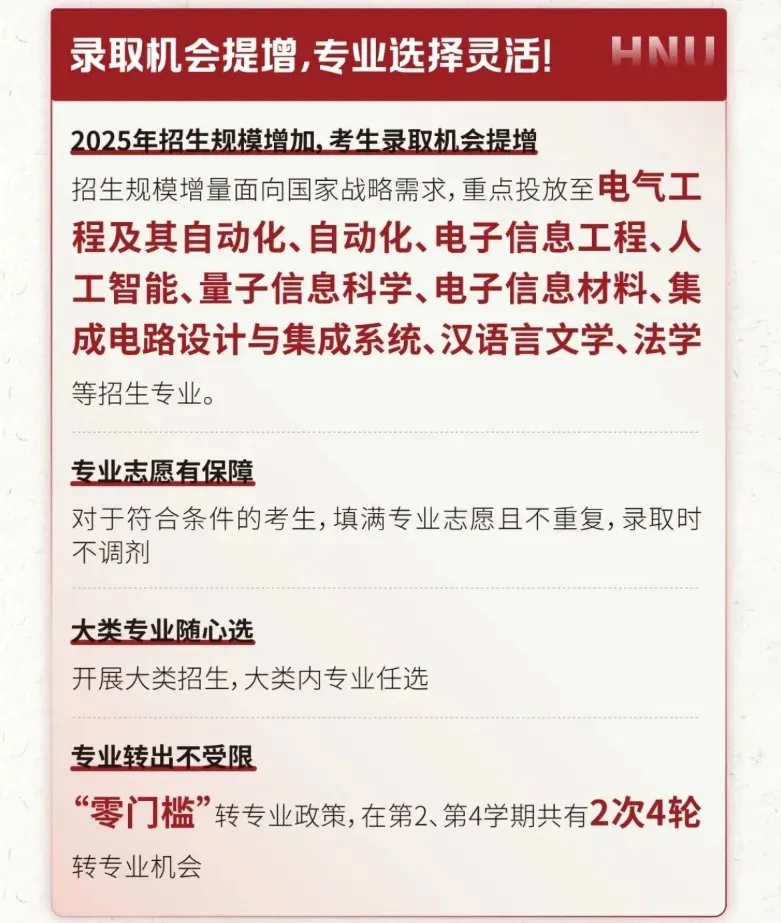 据“湖南大学本科招生”消息,湖南大学2025年本科招生规模增加,招生规模增量面向国家战略需求,重点投放至电气工程及其自动化、自动化、电子信息工程、人工智能、量子信息科学、电子信息材料、集成电路设计与集成系统、汉语言文学、法学等招生专业。