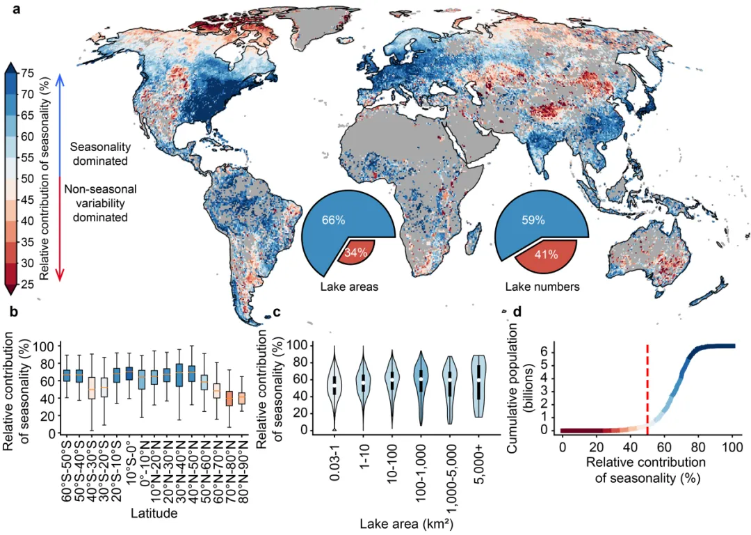基于该数据集,研究团队有了新发现:研究显示,全球66%的湖泊总面积和60%的湖泊数量,其水域面积动态都以季节性变化为主导。更为重要的是,这一季节性主导的分布格局与全球人口分布之间存在高度耦合关系——全球90%以上的人口,都居住在以季节性主导湖泊为主的流域。