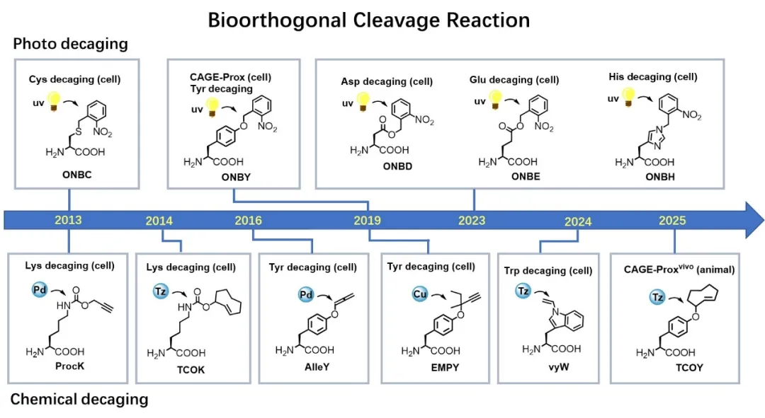 以“点击化学”为代表的生物正交反应因为有效解决了复杂生命体系中特定生物分子的原位标记与示踪等关键科学难题,获得了2022年度诺贝尔化学奖,但这一以“偶联”为核心的化学反应模式仍存在局限,难以实现对生物大分子功能的调控和解析。